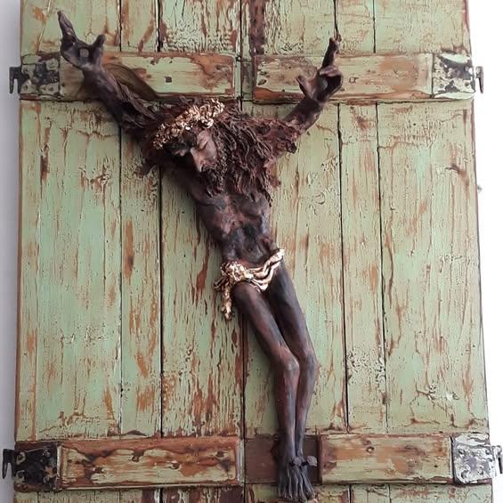 Cristo da Ceramista Bernardete Sousa, Ilha da Madeira. Peça assinada e datada de 2012. Tanga e coroa em folha de ouro de 22 quilates. Criação e decoração da peça, officinacistel.com.