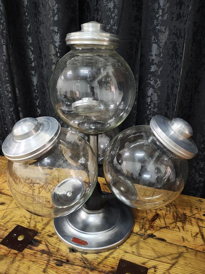 Antiga bomboneira / reboçadeira, rotativa com quatro frascos com tampas em alumínio. Fabrico argentino de 1950.
