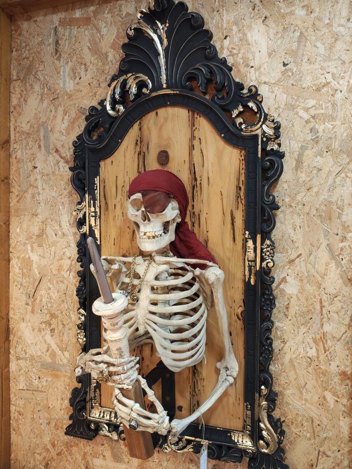 Quadro com pirata em esqueleto, tamanho real, homenagem aos piratas portugueses.