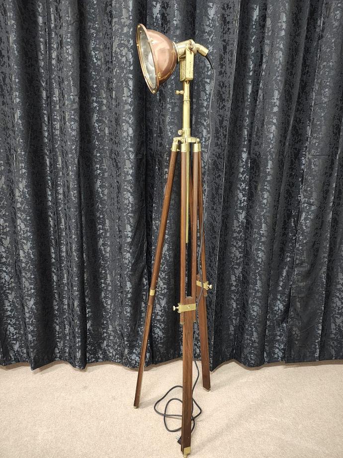 Tripé em madeira e latão com lanterna em cobre e latão. Expancivel na altura.