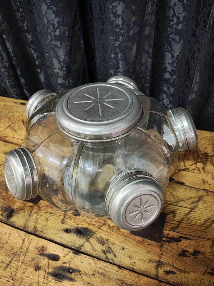 Antiga bomboneira / reboçadeira, rotativa com quatro frascos com tampas em alumínio. Fabrico argentino de 1950.