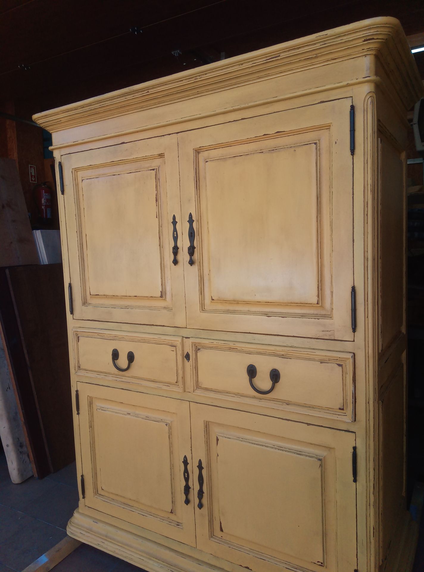Móvel em madeira maciça com acabamento em amarelo envelhecido.