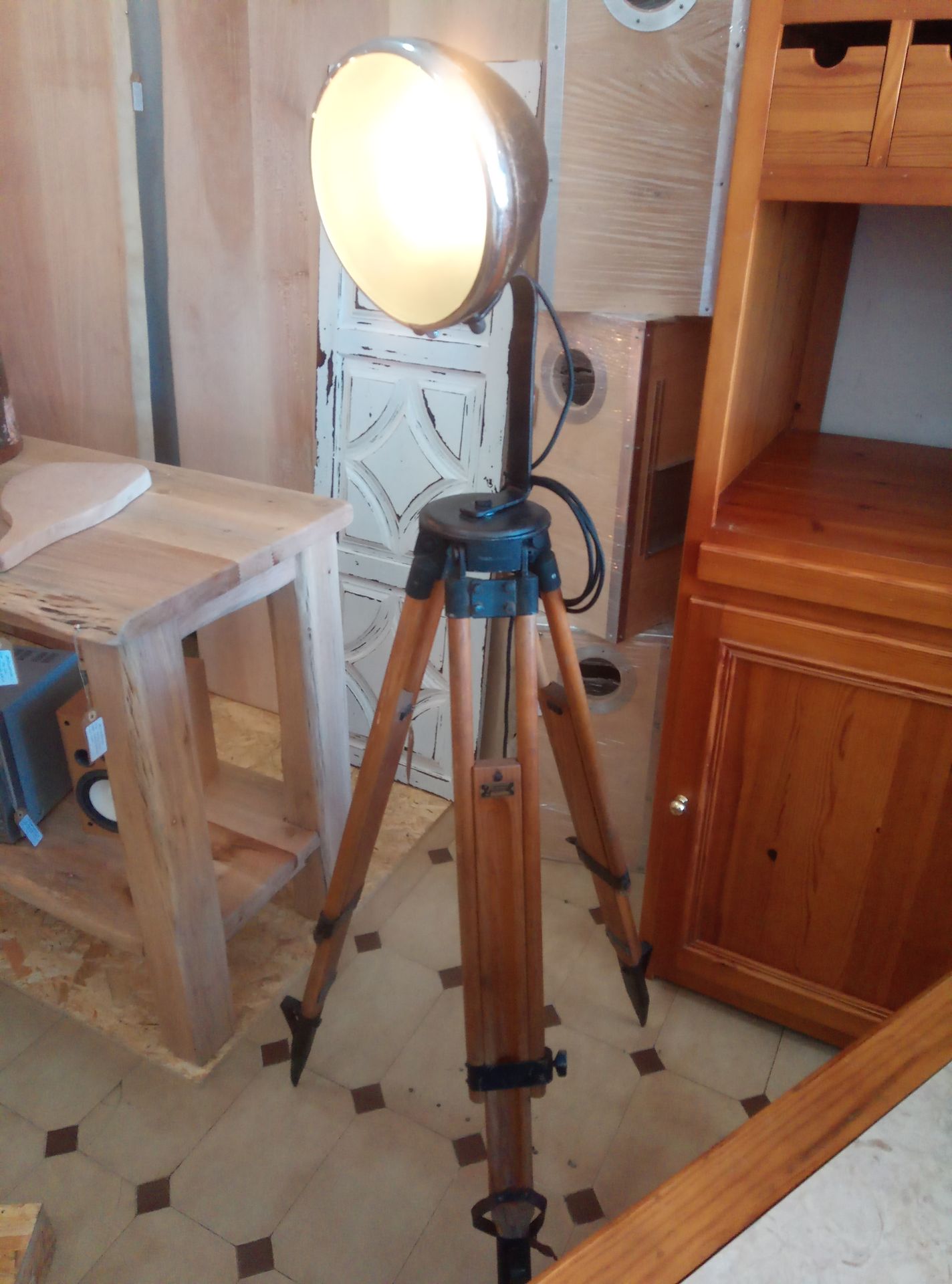 Tripé em madeira maciça com farol Fordson, iluminação 220V.