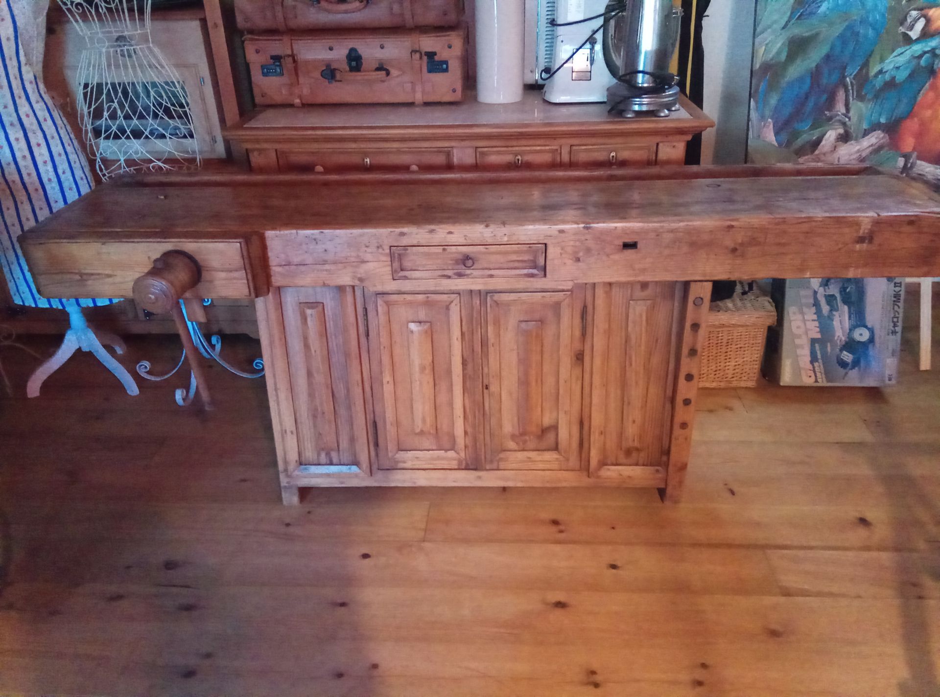 Banco carpinteiro totalmente restaurado com acabamento em goma laca e cera.