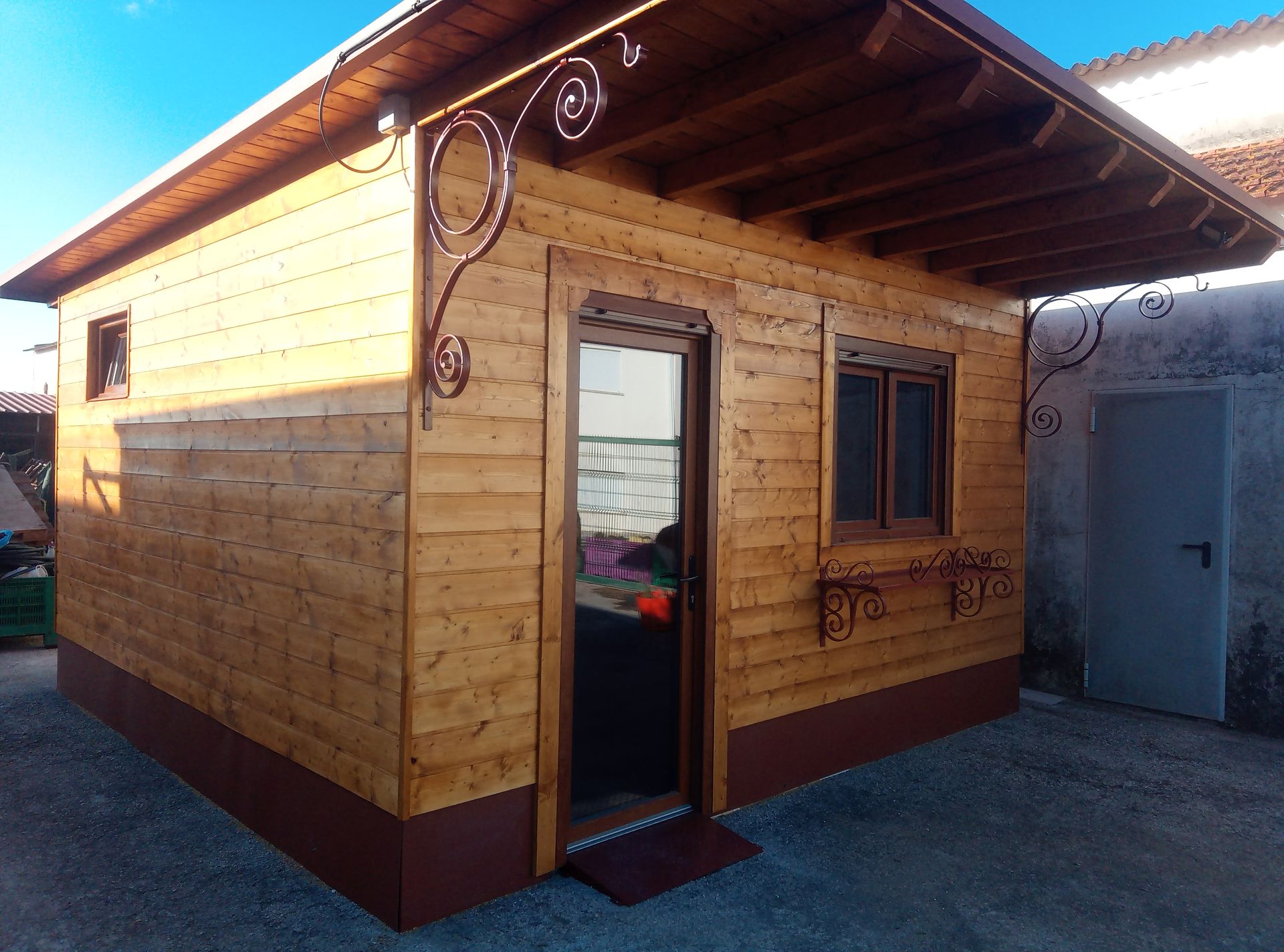 Casa de madeira com dupla parede e isolamento, com portas e janelas em PVC com vidro duplo e estores.