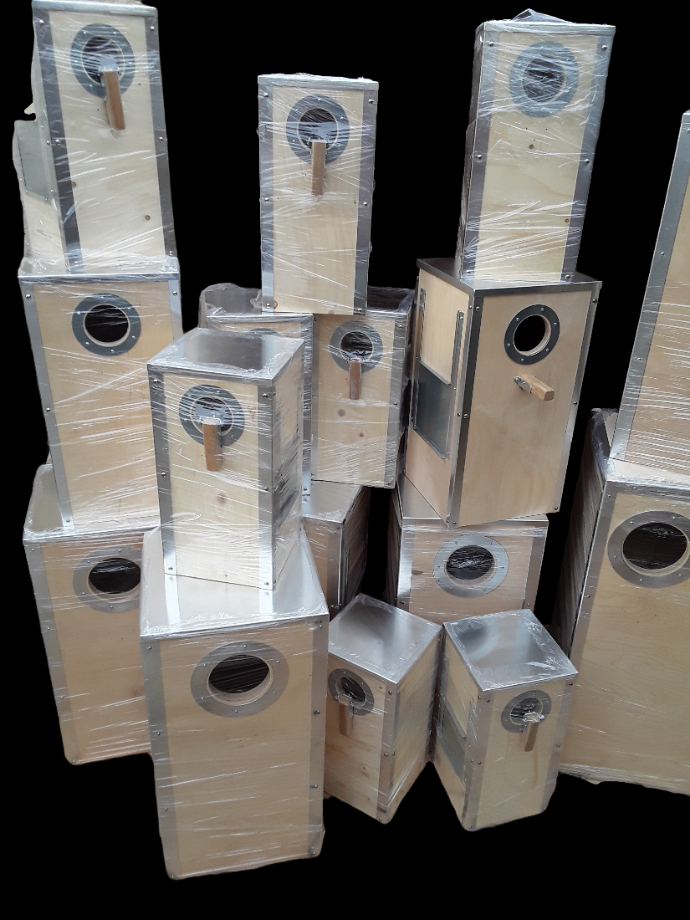 Ninhos madeira vários tamanhos para aves com acabamentos em alumínio.