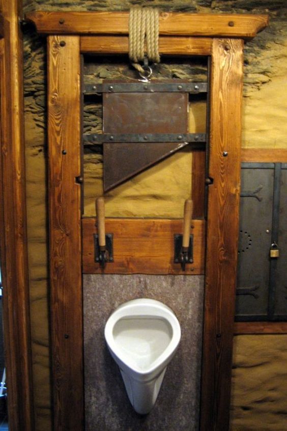 Urinol rústico, guilhotina em madeira e ferro.