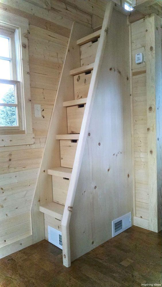 Escada madeira para sótão com gavetas.