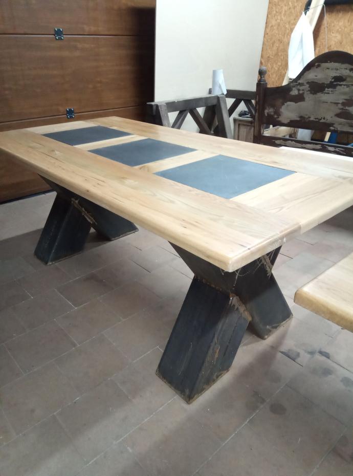 Mesa madeira de carvalho, com aplicação interior em xisto preto, pés em ferro.