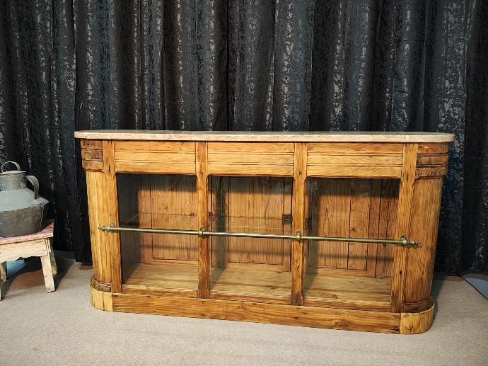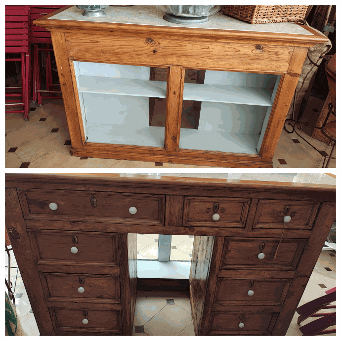Antigo balcão de farmácia em madeira de riga, parte frontal com vitrine, e trazeira com gavetas, puxadores em porcelana.