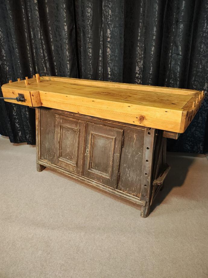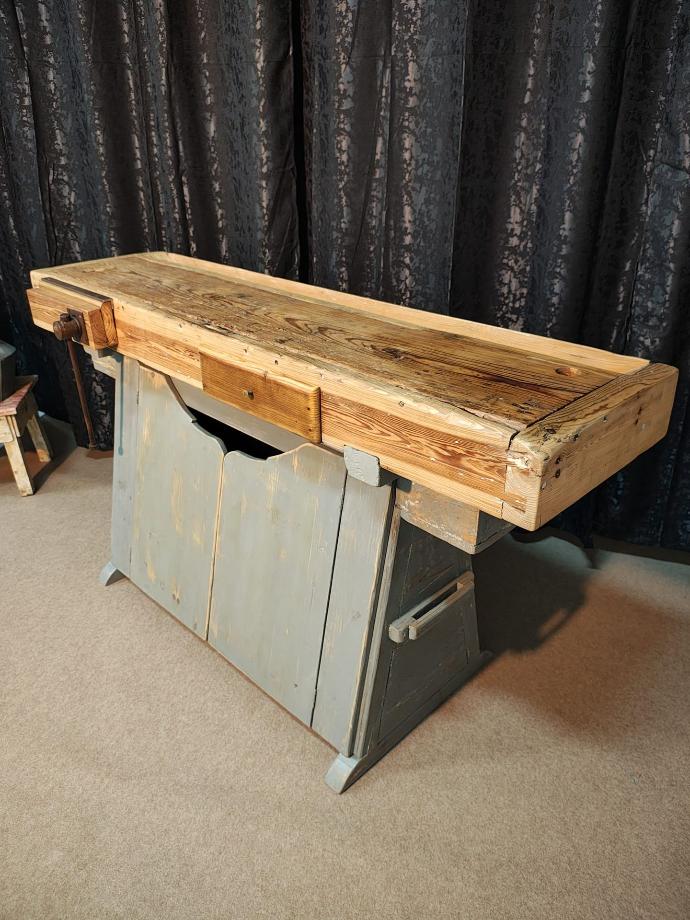 Banco de carpinteiro com base cor cinzenta, tinta original, com duas portas, totalmente restaurado.
