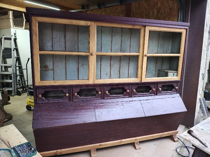 Móvel mercearia antigo com três tulhas, cinco gavetas e três portas de correr, tinta original.