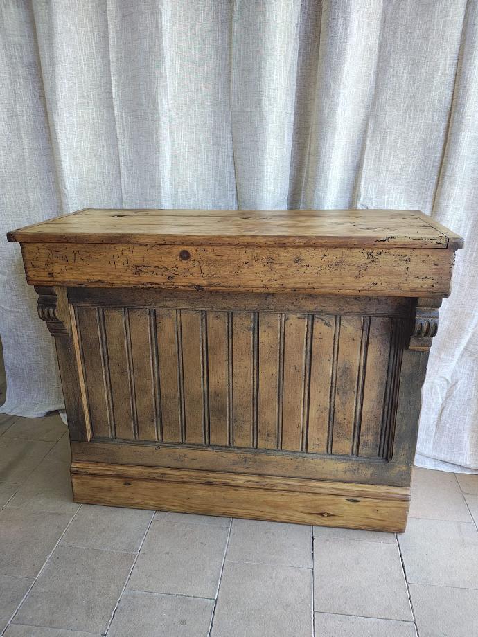 Balcão de antiga mercearia, venda de bacalhau, em madeira de pinho velho com parteleiras interiores.