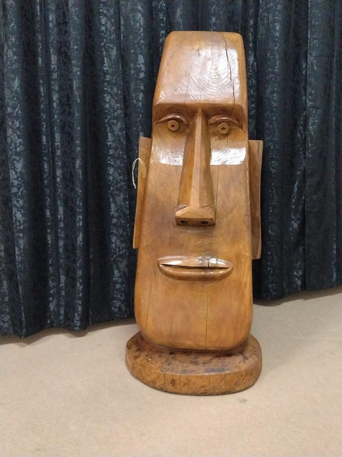 Escultura em forma de Moai em madeira de pinho manso.