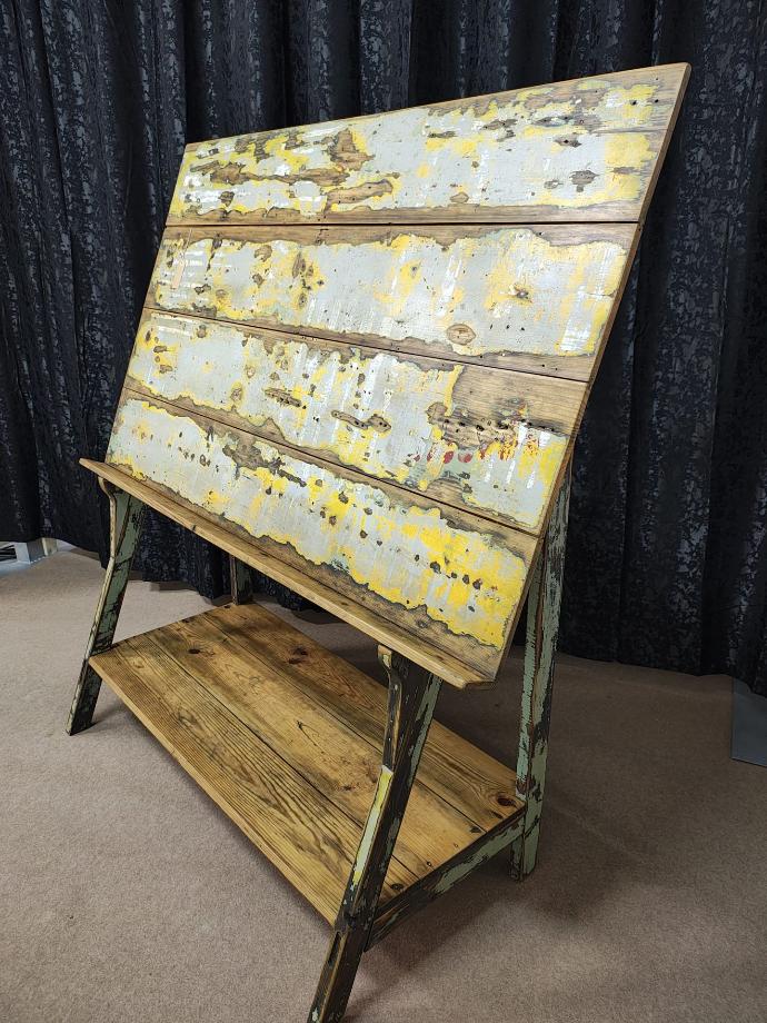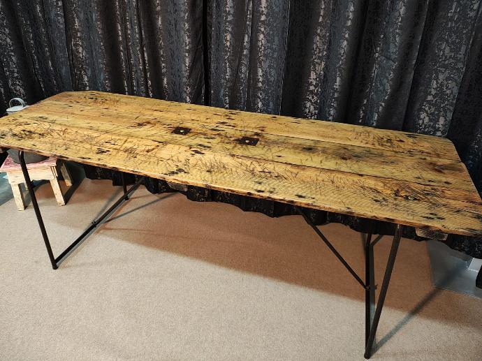 Mesa com tampo em madeira de pinho, antiga bancada de trabalho, com pernas em ferro desmontáveis.