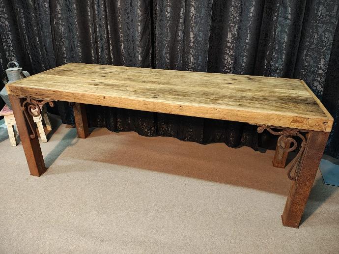 Mesa em madeira de castanho, antiga bancada de trabalho, pés em ferro com ferrugem natural.