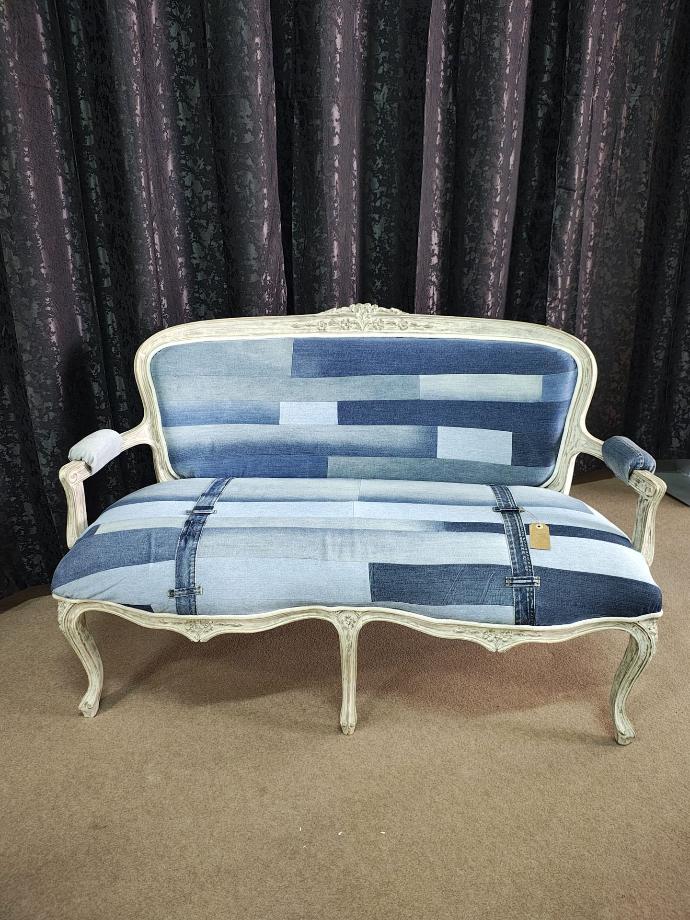 Sofá com pintura decapé em cor pérola com forro a ganga. Dois lugares.