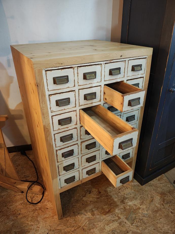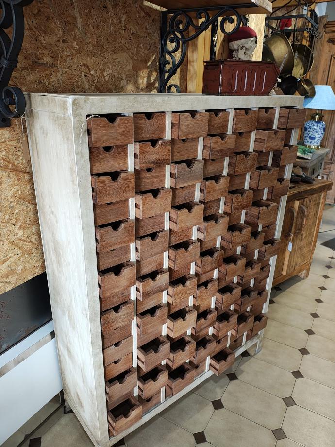 Móvel em madeira e ferro com 102 gavetas.