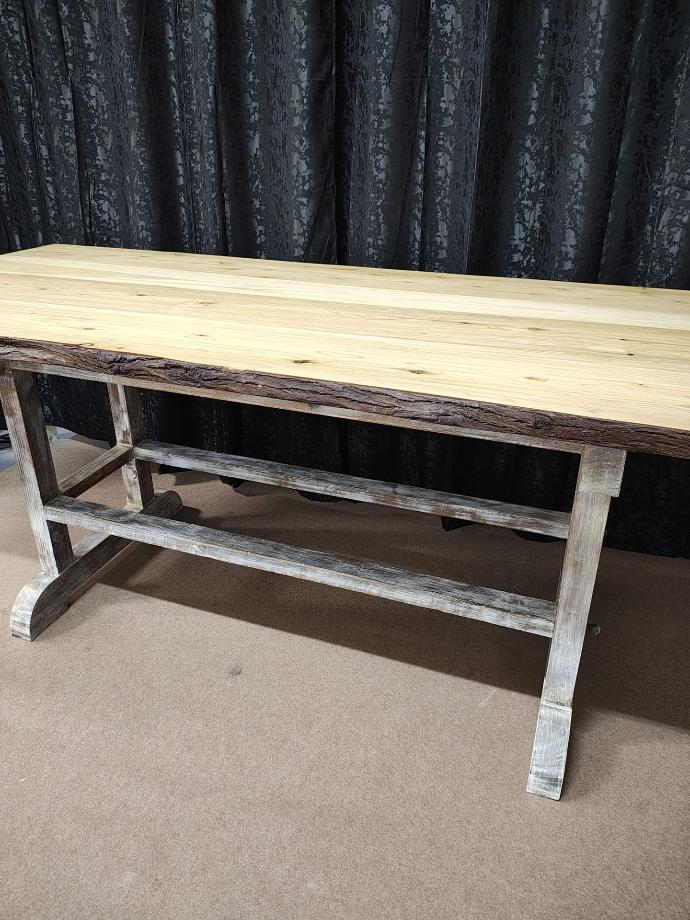 Mesa de apoio ou entrada em madeira maciça e acabamento em resina acrílica, com estilo rústico.
