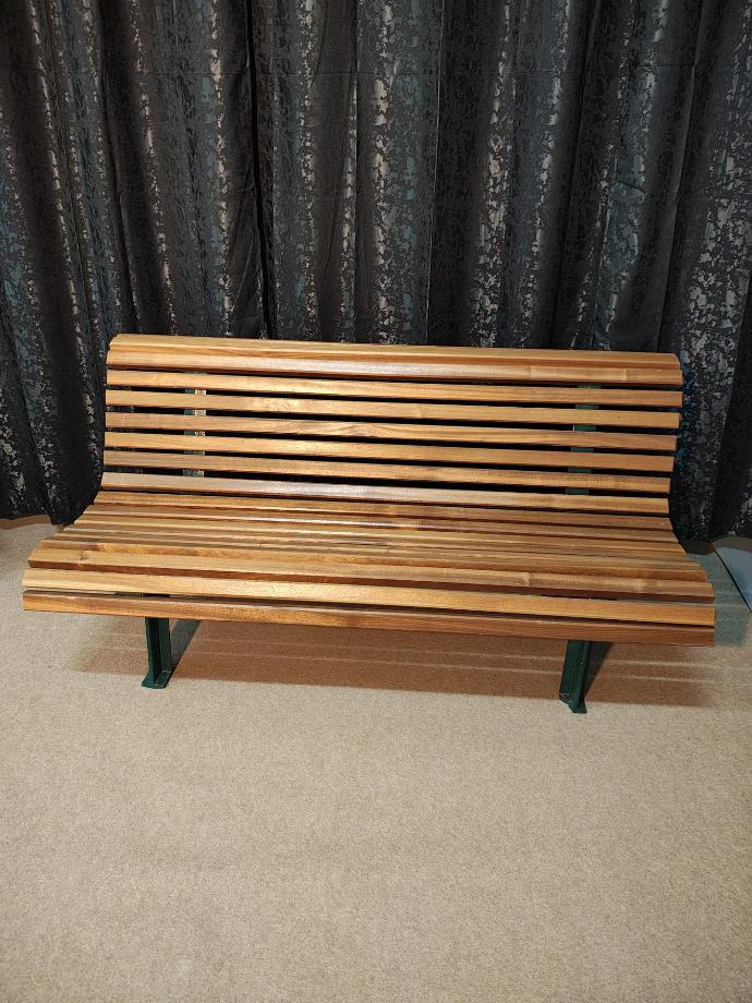 Banco de jardim / exterior com madeira de kambala, pés em ferro forjado lacado a verde.