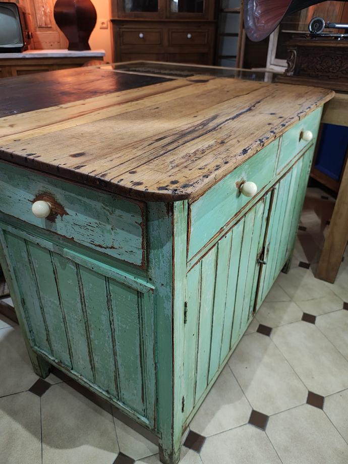 Antiga bancada de cozinha, cor original com puchadores em porcelana creme.