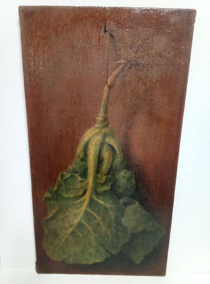 Quadro pintura a óleo sobre tela de linho com armação madeira. Motivo couve portuguesa pendurada. Pintor: "Vallo"