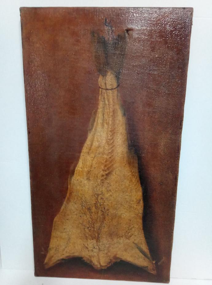 Quadro pintura a óleo sobre tela de linho com armação madeira. Motivo bacalhau pendurado. Pintor: "Vallo"